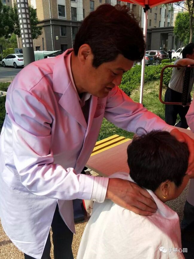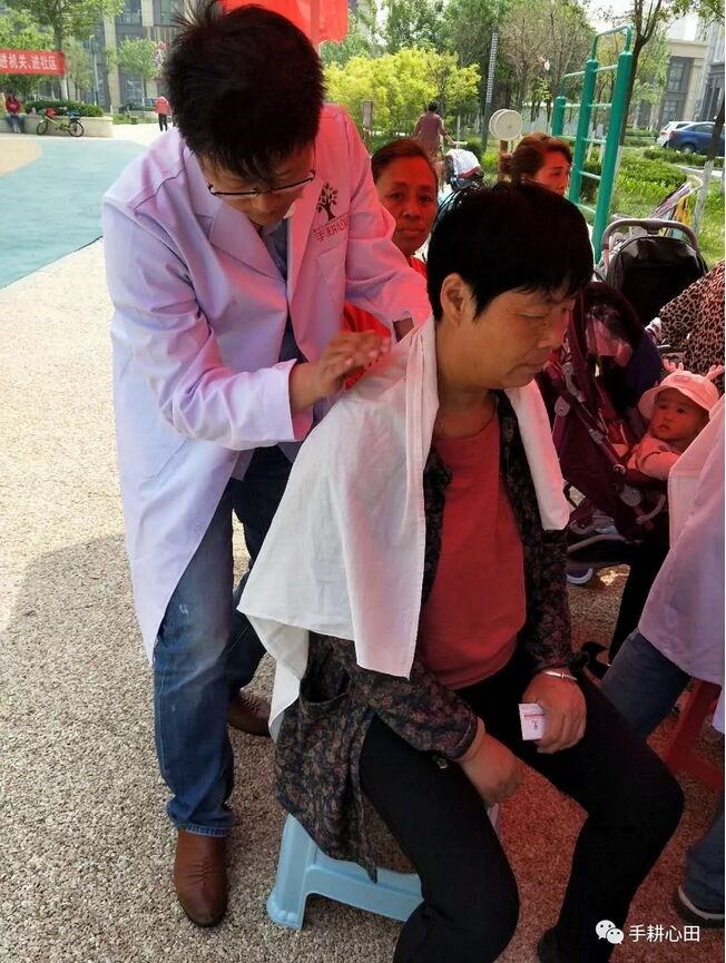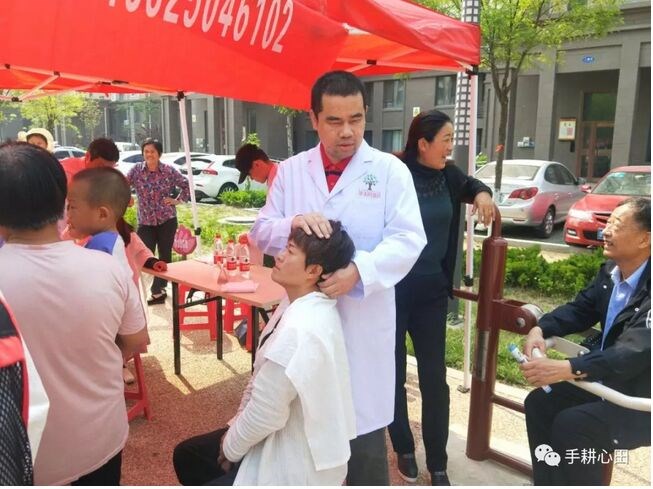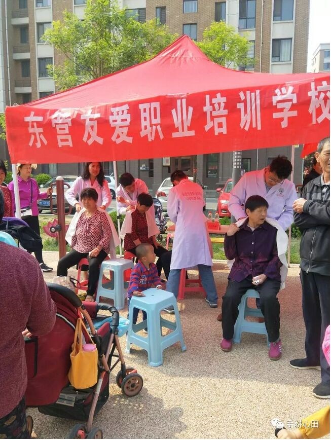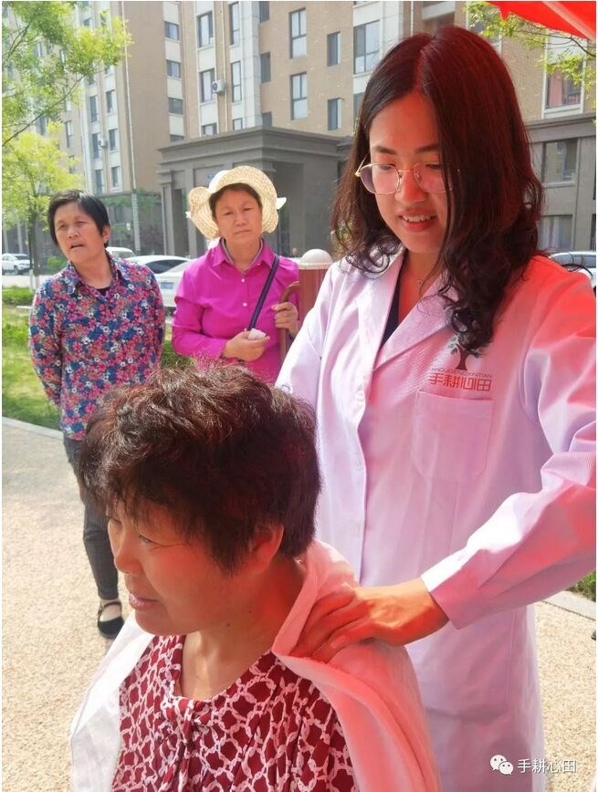 2019年05月11号,在胜景瑞香苑社区,商老师带领学校的高级按摩师为社区女性居民做义诊。