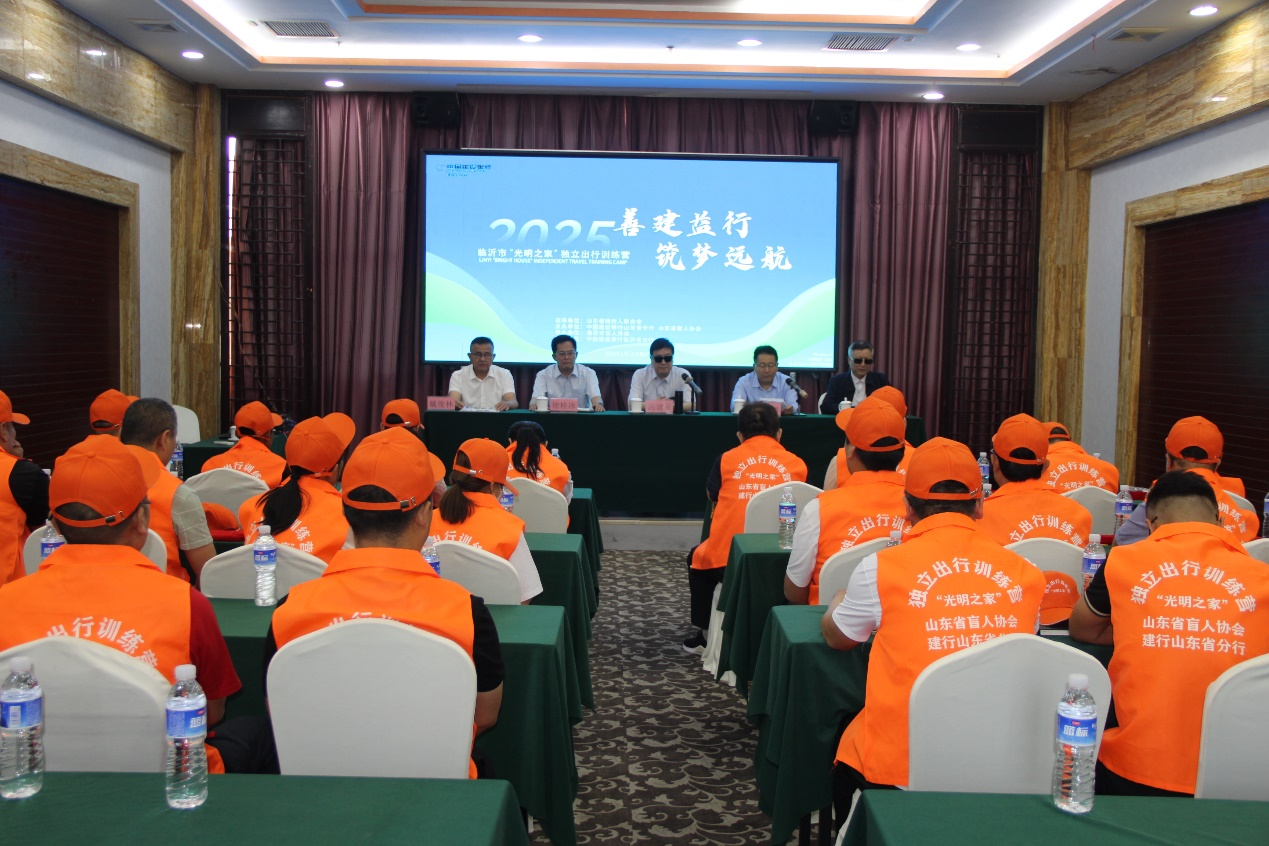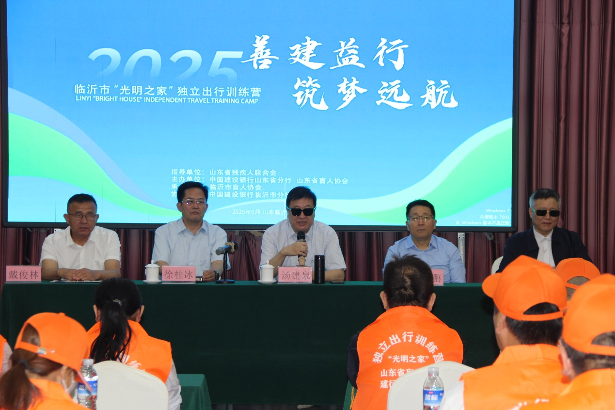 5月19日上午,临沂市“光明之家”独立出行训练营开营仪式在羲之宾馆隆重举行。活动旨在通过专业化培训课程,帮助中途失明者增强社会适应能力。中国盲协副主席、山东省盲协主席汤建泉,临沂市残联党组成员、副理事长蔡明朋、中国建设银行临沂分行党委委员、副行长徐桂冰,临沂市盲协主席戴俊林,大爱先锋公益平台总监王福德出席开营仪式,来自全市的25名中途失明视障学员参加训练学习。